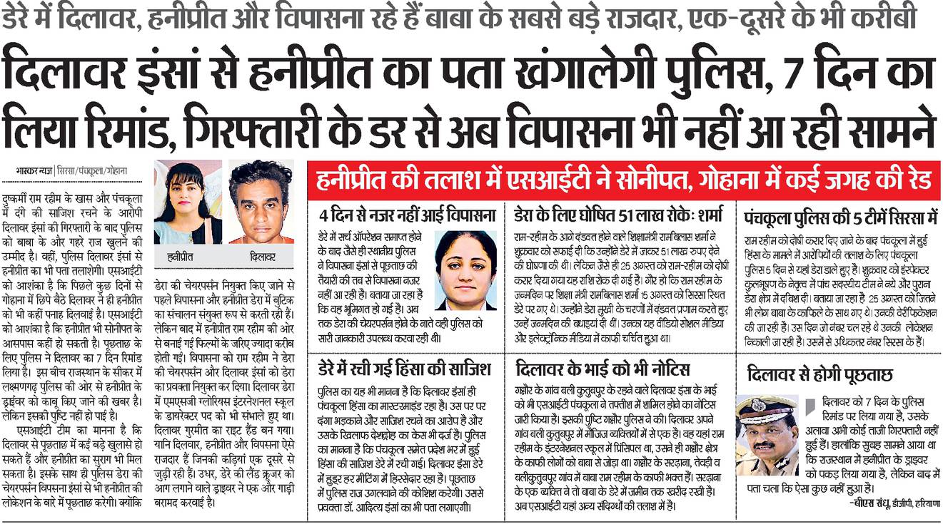 सीबीआई कोर्ट की ओर से डेरा प्रमुख गुरमीत सिंह को 25 अगस्त के दिन दोषी करार देने के बाद पंचकूला में भड़की हिंसा और डेरा सच्चा सौदा से एकाएक हनीप्रीत गायब होने के मामले में बुधवार को डेरा चेयरपर्सन