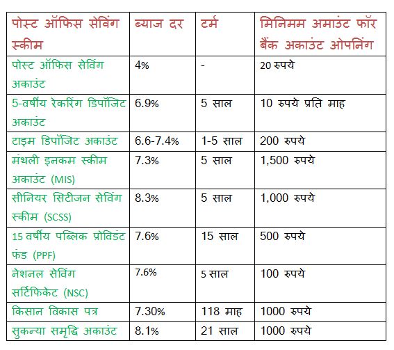- पोस्ट ऑफिस सेविंग स्कीम: आप मात्र 20 रुपये में यह अकाउंट खोल सकते हैं। यह अकाउंट सिर्फ कैश के माध्यम से ही खोला जा सकता है। अगर आप यह खाता 500 रुपये से खोलते हैं तो आपको इस खाते पर चेक की सुविधा उपलब्ध करवाई जाती है हालांकि इसके लिए आपको अपने खाते में न्यूनतम 500 रुपये रखने ही होंगे। यह खाता खुलवाने के पहले या बाद में इसमें किसी को नॉमिनी बना सकते हैं। वहीं इस खाते को एक पोस्ट ऑफिस से दूसरे पोस्ट ऑफिस में ट्रांस्फर भी करवाया जा सकता है। हालांकि इस खाते को एक्टिव रखने के लिए तीन वित्तीय वर्षों में जमा या निकासी का कम से कम एक लेनदेन जरूरी है। इस अकाउंट में एटीएम की सुविधा भी उपलब्ध होती है। वहीं इस खाते में जमा राशि पर 4 फीसद का ब्याज दिया जाता है।