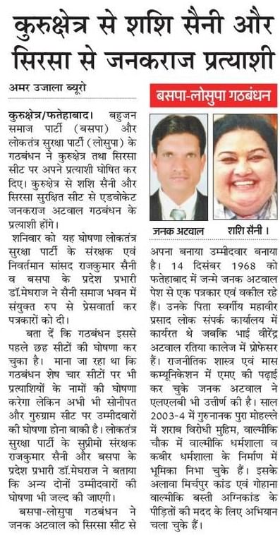 BSP-LSP गठबंधन ने सिरसा और कुरुक्षेत्र से उतारे ये सैनिक